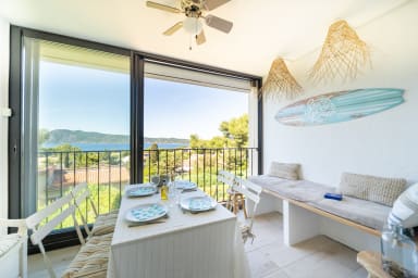 Spectacular sea view from this T2/3 apartment, comprising a double bedroom, a sleeping area, a living room with kitchen and a sheltered loggia. Free parking. Pool, tennis, activities in the residence
